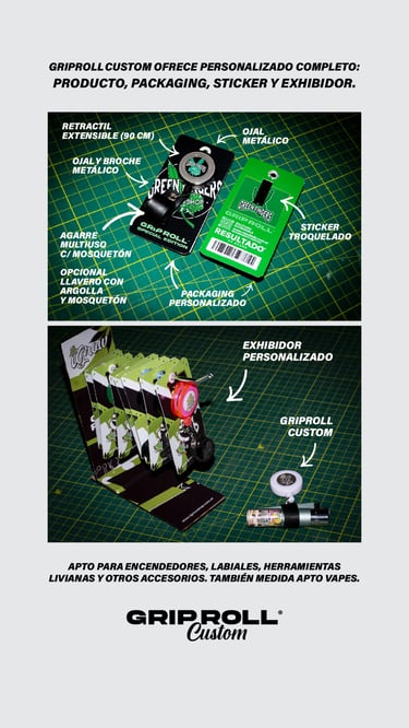 Griproll ofrece un personalizado total del producto para identidad y merchandising para marcas que lo deseen. La customización incluye estampa en extensible, packaging, stickers troquelados y exhibidor. Para facilitar las tareas a clientes potenciales ofrecemos el servicio de diseño gráfico sin cargo y envíos a todo el país.